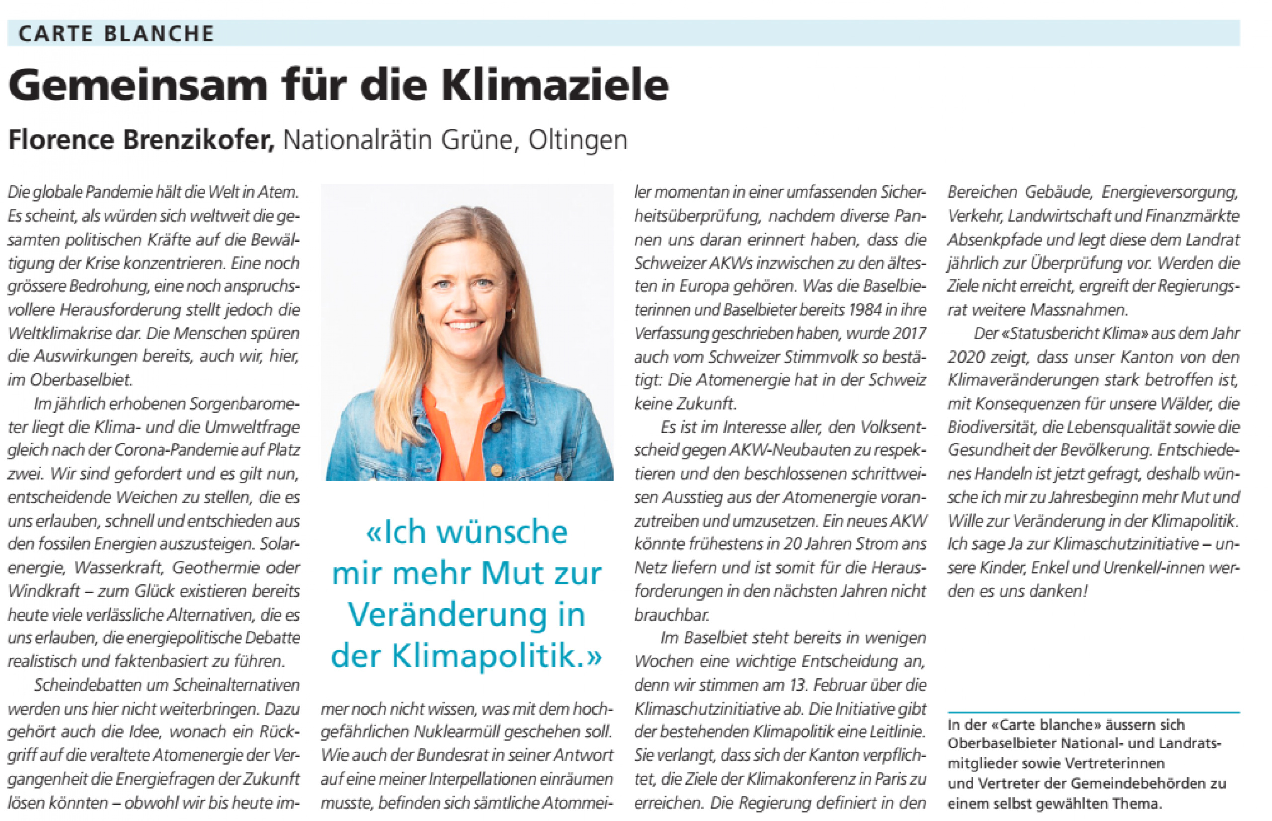 im Oberbaselbiet. Im jährlich erhobenen Sorgenbarometer liegt die Klima- und die Umweltfrage gleich nach der Corona-Pandemie auf Platz zwei. Wir sind gefordert und es gilt nun, entscheidende Weichen zu stellen, die es uns erlauben, schnell und entschieden aus den fossilen Energien auszusteigen. Solarenergie, Wasserkraft, Geothermie oder Windkraft – zum Glück existieren bereits heute viele verlässliche Alternativen, die es uns erlauben, die energiepolitische Debatte realistisch und faktenbasiert zu führen. Scheindebatten um Scheinalternativen werden uns hier nicht weiterbringen. Dazu gehört auch die Idee, wonach ein Rückgriff auf die veraltete Atomenergie der Vergangenheit die Energiefragen der Zukunft lösen könnten – obwohl wir bis heute immer noch nicht wissen, was mit dem hochgefährlichen Nuklearmüll geschehen soll. Wie auch der Bundesrat in seiner Antwort auf eine meiner Interpellationen einräumen musste, befinden sich sämtliche Atommeiler momentan in einer umfassenden Sicherheitsüberprüfung, nachdem diverse Pannen uns daran erinnert haben, dass die Schweizer AKWs inzwischen zu den ältesten in Europa gehören. Was die Baselbieterinnen und Baselbieter bereits 1984 in ihre Verfassung geschrieben haben, wurde 2017 auch vom Schweizer Stimmvolk so bestätigt: Die Atomenergie hat in der Schweiz keine Zukunft. Es ist im Interesse aller, den Volksentscheid gegen AKW-Neubauten zu respektieren und den beschlossenen schrittweisen Ausstieg aus der Atomenergie voranzutreiben und umzusetzen. Ein neues AKW könnte frühestens in 20 Jahren Strom ans Netz liefern und ist somit für die Herausforderungen in den nächsten Jahren nicht brauchbar. Im Baselbiet steht bereits in wenigen Wochen eine wichtige Entscheidung an, denn wir stimmen am 13. Februar über die Klimaschutzinitiative ab. Die Initiative gibt der bestehenden Klimapolitik eine Leitlinie. Sie verlangt, dass sich der Kanton verpflichtet, die Ziele der Klimakonferenz in Paris zu erreichen. Die Regierung definiert in den Bereichen Gebäude, Energieversorgung, Verkehr, Landwirtschaft und Finanzmärkte Absenkpfade und legt diese dem Landrat jährlich zur Überprüfung vor. Werden die Ziele nicht erreicht, ergreift der Regierungsrat weitere Massnahmen. Der «Statusbericht Klima» aus dem Jahr 2020 zeigt, dass unser Kanton von den Klimaveränderungen stark betroffen ist, mit Konsequenzen für unsere Wälder, die Biodiversität, die Lebensqualität sowie die