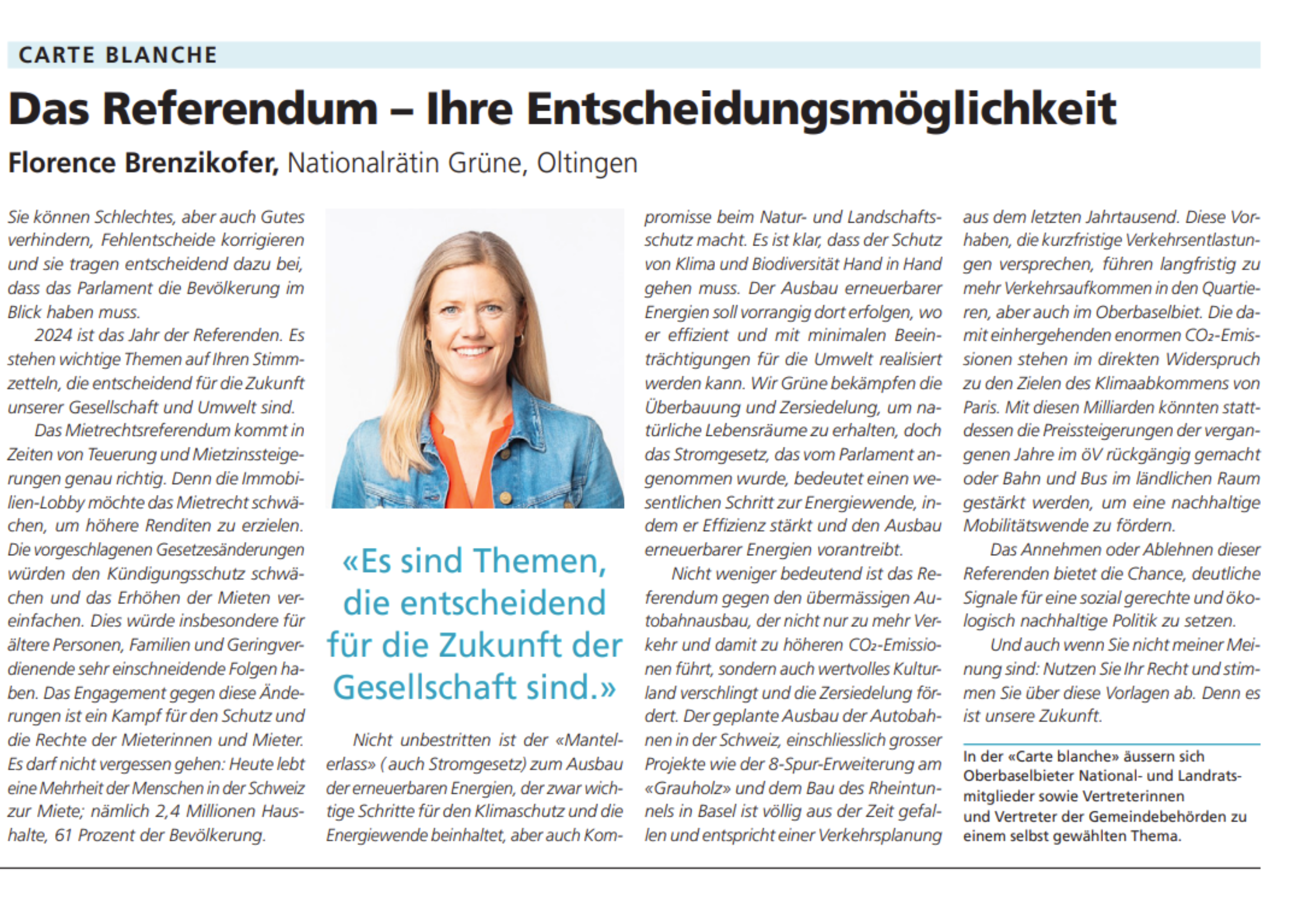 Nicht weniger bedeutend ist das Referendum gegen den übermässigen Autobahnausbau, der nicht nur zu mehr Verkehr und damit zu höheren CO2-Emissionen führt, sondern auch wertvolles Kulturland verschlingt und die Zersiedelung fördert. Der geplante Ausbau der Autobahnen in der Schweiz, einschliesslich grosser Projekte wie der 8-Spur-Erweiterung am «Grauholz» und dem Bau des Rheintunnels in Basel, ist völlig aus der Zeit gefallen und entspricht einer Verkehrsplanung aus dem letzten Jahrtausend. Diese Vorhaben, die kurzfristige Verkehrsentlastungen versprechen, führen langfristig zu mehr Verkehrsaufkommen in den Quartieren, aber auch im Oberbaselbiet. Die damit einhergehenden enormen CO2-Emissionen stehen im direkten Widerspruch zu den Zielen des Klimaabkommens von Paris. Mit diesen Milliarden könnten stattdessen die Preissteigerungen der vergangenen Jahre im öffentlichen Verkehr rückgängig gemacht oder Bahn und Bus im ländlichen Raum gestärkt werden, um eine nachhaltige Mobilitätswende zu fördern.
