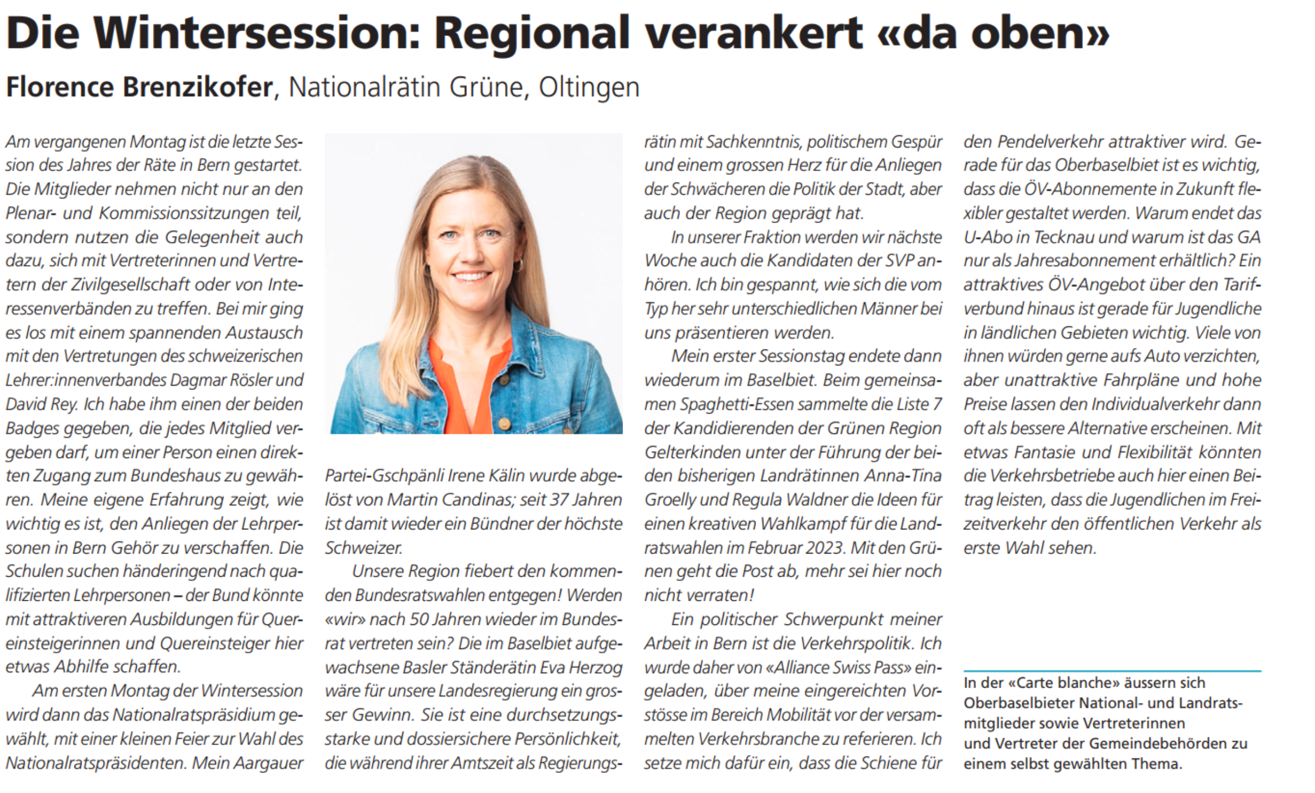 In unserer Fraktion werden wir nächste Woche auch die Kandidaten der SVP anhören. Ich bin gespannt, wie sich die vom Typ her sehr unterschiedlichen Männer bei uns präsentieren werden. Mein erster Sessionstag endete dann wiederum im Baselbiet. Beim gemeinsamen Spaghetti-Essen sammelte die Liste 7 der Kandidierenden der Grünen Region Gelterkinden unter der Führung der beiden bisherigen Landrätinnen Anna-Tina Groelly und Regula Waldner die Ideen für