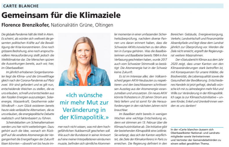 im Oberbaselbiet. Im jährlich erhobenen Sorgenbarometer liegt die Klima- und die Umweltfrage gleich nach der Corona-Pandemie auf Platz zwei. Wir sind gefordert und es gilt nun, entscheidende Weichen zu stellen, die es uns erlauben, schnell und entschieden aus den fossilen Energien auszusteigen. Solarenergie, Wasserkraft, Geothermie oder Windkraft – zum Glück existieren bereits heute viele verlässliche Alternativen, die es uns erlauben, die energiepolitische Debatte realistisch und faktenbasiert zu führen. Scheindebatten um Scheinalternativen werden uns hier nicht weiterbringen. Dazu gehört auch die Idee, wonach ein Rückgriff auf die veraltete Atomenergie der Vergangenheit die Energiefragen der Zukunft lösen könnten – obwohl wir bis heute immer noch nicht wissen, was mit dem hochgefährlichen Nuklearmüll geschehen soll. Wie auch der Bundesrat in seiner Antwort auf eine meiner Interpellationen einräumen musste, befinden sich sämtliche Atommeiler momentan in einer umfassenden Sicherheitsüberprüfung, nachdem diverse Pannen uns daran erinnert haben, dass die Schweizer AKWs inzwischen zu den ältesten in Europa gehören. Was die Baselbieterinnen und Baselbieter bereits 1984 in ihre Verfassung geschrieben haben, wurde 2017 auch vom Schweizer Stimmvolk so bestätigt: Die Atomenergie hat in der Schweiz keine Zukunft. Es ist im Interesse aller, den Volksentscheid gegen AKW-Neubauten zu respektieren und den beschlossenen schrittweisen Ausstieg aus der Atomenergie voranzutreiben und umzusetzen. Ein neues AKW könnte frühestens in 20 Jahren Strom ans Netz liefern und ist somit für die Herausforderungen in den nächsten Jahren nicht brauchbar. Im Baselbiet steht bereits in wenigen Wochen eine wichtige Entscheidung an, denn wir stimmen am 13. Februar über die Klimaschutzinitiative ab. Die Initiative gibt der bestehenden Klimapolitik eine Leitlinie. Sie verlangt, dass sich der Kanton verpflichtet, die Ziele der Klimakonferenz in Paris zu erreichen. Die Regierung definiert in den Bereichen Gebäude, Energieversorgung, Verkehr, Landwirtschaft und Finanzmärkte Absenkpfade und legt diese dem Landrat jährlich zur Überprüfung vor. Werden die Ziele nicht erreicht, ergreift der Regierungsrat weitere Massnahmen. Der «Statusbericht Klima» aus dem Jahr 2020 zeigt, dass unser Kanton von den Klimaveränderungen stark betroffen ist, mit Konsequenzen für unsere Wälder, die Biodiversität, die Lebensqualität sowie die