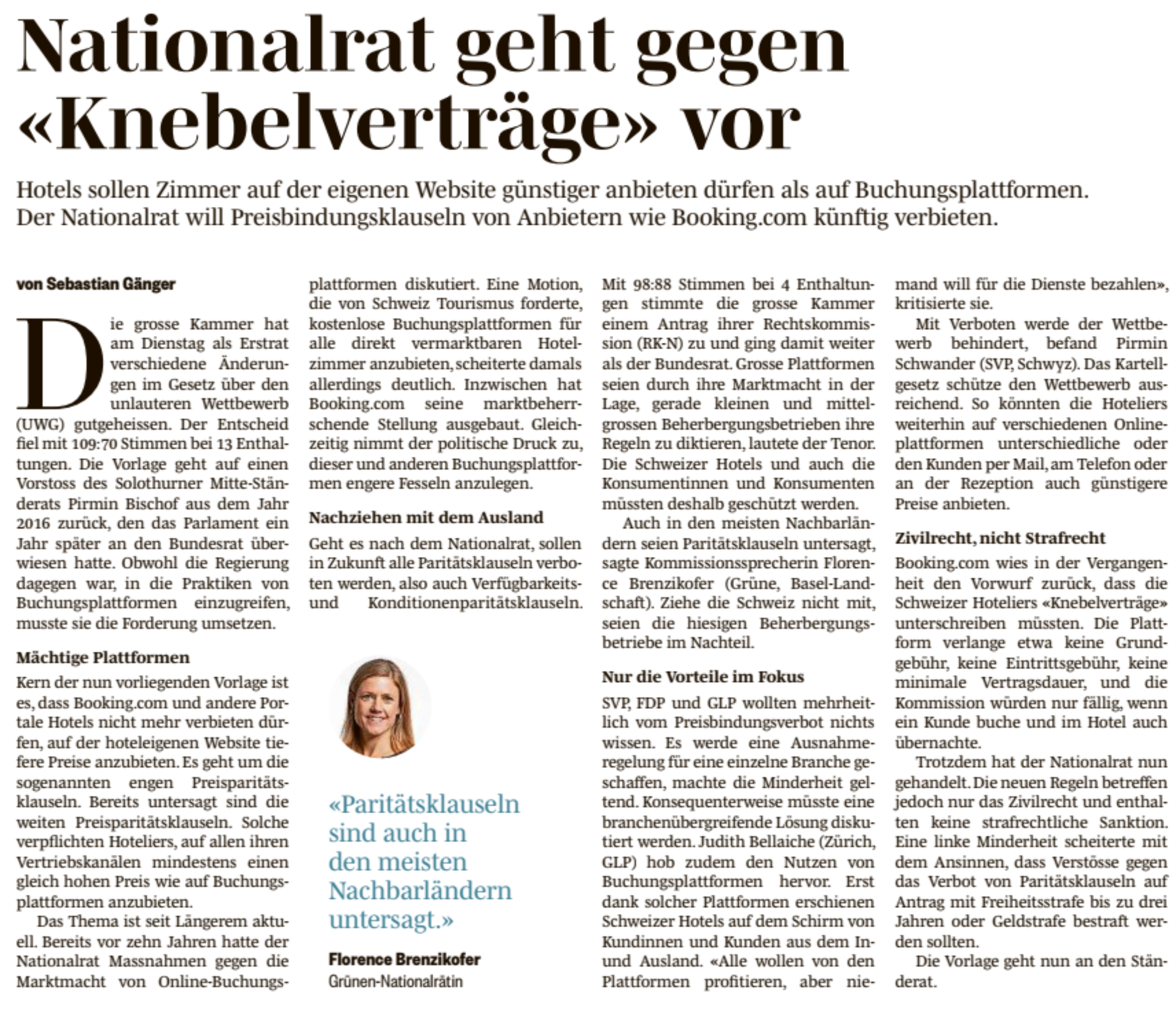 Geht es nach dem Nationalrat, sollen in Zukunft alle Paritätsklauseln verboten werden, also auch Verfügbarkeitsund Konditionenparitätsklauseln. Mit 98:88 Stimmen bei 4 Enthaltungen stimmte die grosse Kammer einem Antrag ihrer Rechtskommission (RK-N) zu und ging damit weiterals der Bundesrat. Grosse Plattformen seien durch ihre Marktmacht in der Lage, gerade kleinen und mittelgrossen Beherbergungsbetrieben ihre Regeln zu diktieren, lautete der Tenor. Die Schweizer Hotels und auch die Konsumentinnen und Konsumentenmüssten deshalb geschützt werden. Auch in den meisten Nachbarländern seien Paritätsklauseln untersagt, sagte Kommissionssprecherin Florence Brenzikofer (Grüne, Basel-Landschaft). Ziehe die Schweiz nicht mit, seien die hiesigen Beherbergungsbetriebe im Nachteil.